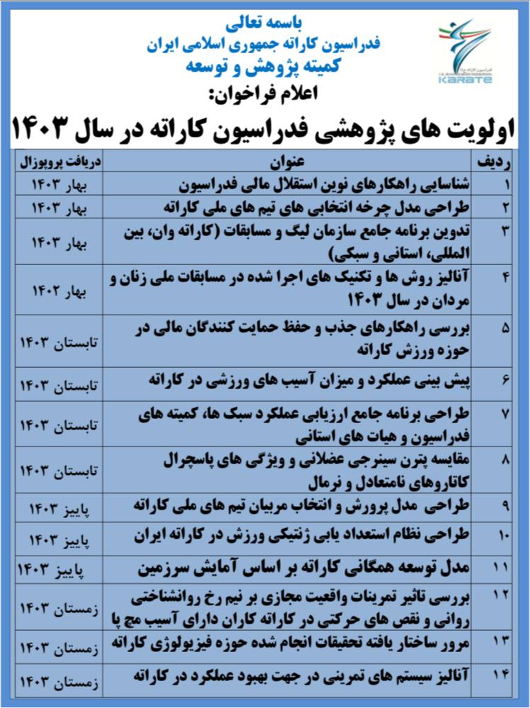 محمدرضا باتوانی رئیس کمیته پژوهش فدراسیون کاراته در این باره اظهار داشت: این فراخوان از طریق مکاتبه فدراسیون با مدیر کل تربیت بدنی وزارت علوم، تحقیقات و فناوری به تمام دانشگاهها، پژوهشگاهها و مراکز علمی پژوهشی تابعه سراسر کشور اطلاعرسانی شده است. در همین راستا از پژوهشگران، صاحبنظران، اندیشمندان، دانشجویان، اساتید و اعضای محترم هیئتعلمی دانشگاه ها و مراکز پژوهشی سراسر کشور دعوت به عمل می آید تا ضمن ارائه پیشنهادهای پژوهشی خود به فدراسیون ذیل اولویتهای پژوهشی اعلامی، کمیته پژوهش و توسعه فدراسیون را در تحقق اهداف پیشبینی شده این فدراسیون همراهی کنند.