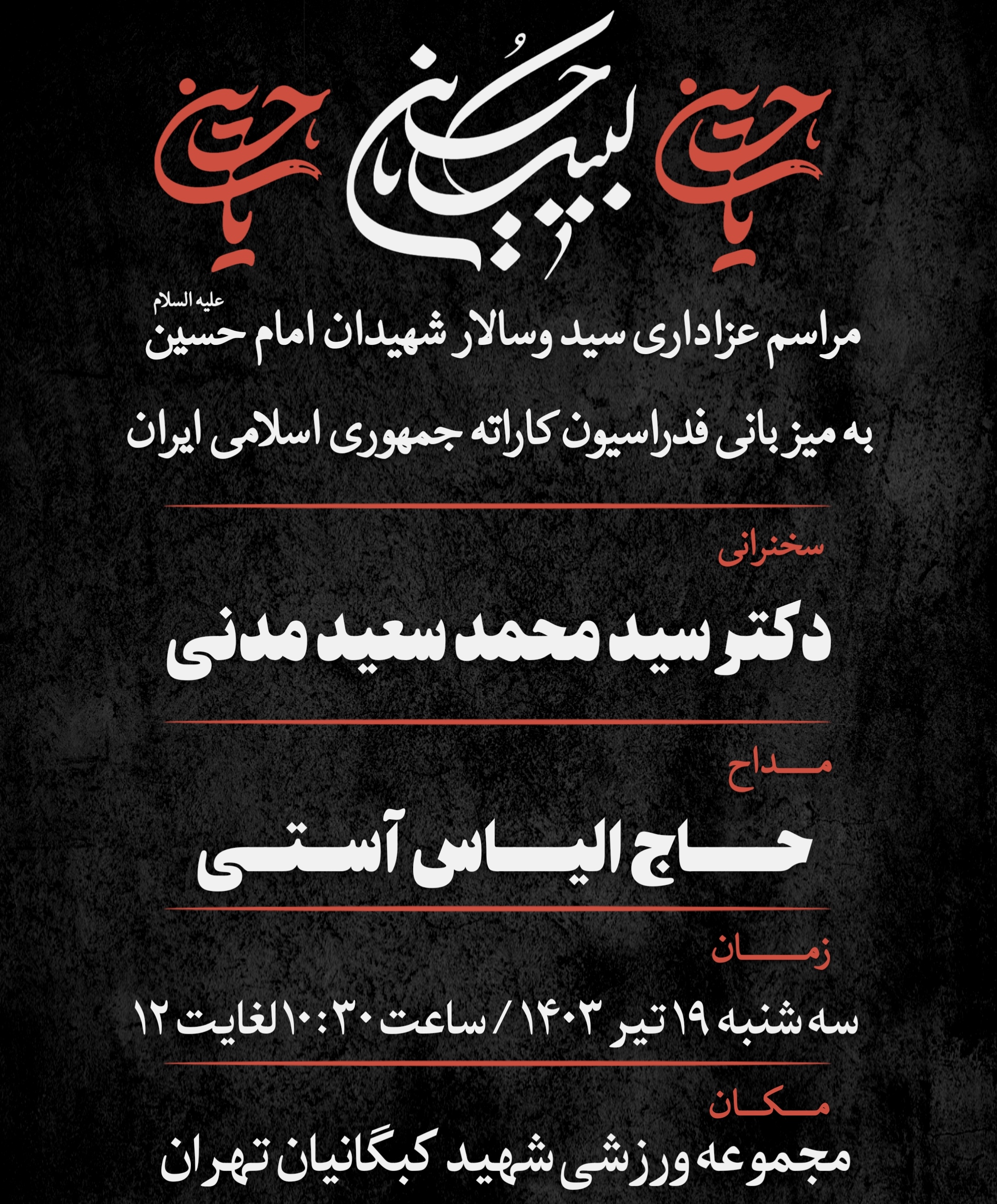 لذا از تمامی اعضای جامعه کاراته اعم از مسئولان، اعضای هیات رئیسه، پیشکسوتان، مربیان، داوران و قهرمانان در دو بخش آقایان و بانوان دعوت می گردد در مراسم عزاداری فوق شرکت نمایند.