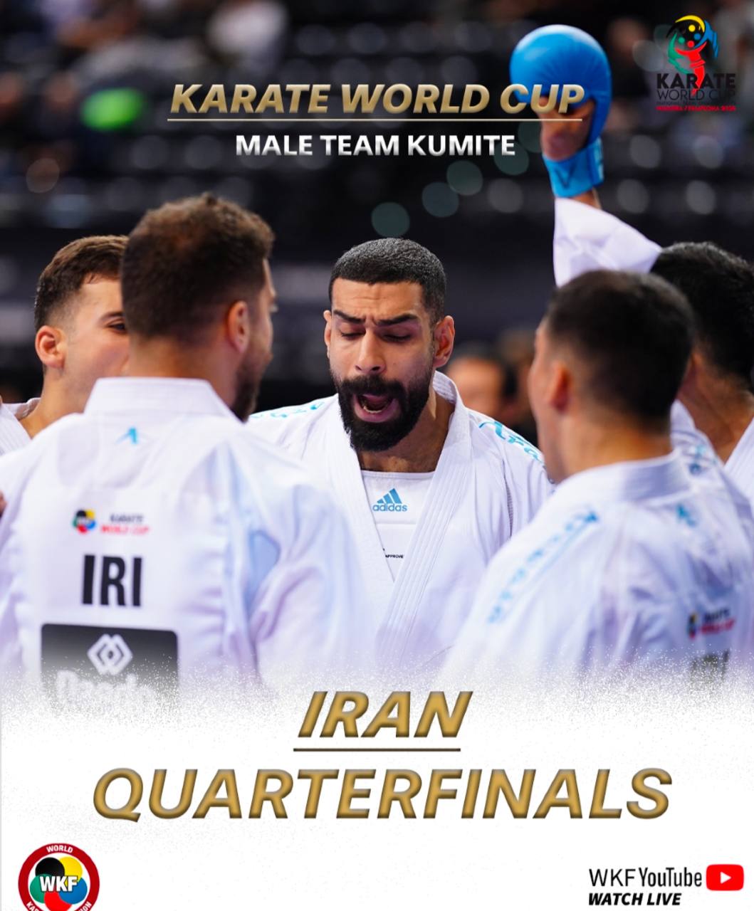 به گزارش روابط عمومی فدراسیون کاراته، کومیته تیمی مردان ایران با ترکیب بهمن عسگری، مهدی خدابخشی، صالح اباذری،مهدی عاشوری، مهدی شهگل، مرتضی نعمتی، محمود نعمتی و مهدی گنج زاده در مرحله یک چهارم نهایی به روی تاتامی رفت و مقابل تیم اسلواکی قرار گرفت و موفق شد با نتیجه ۳ بر صفر پیروز شود و به نیمه نهایی راه یابد.